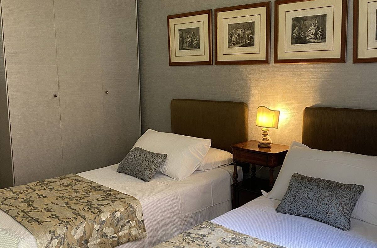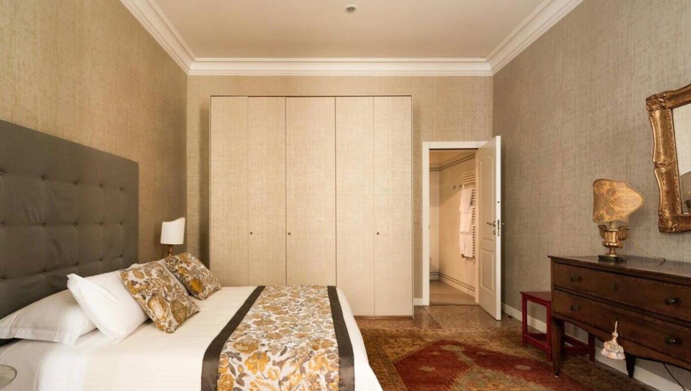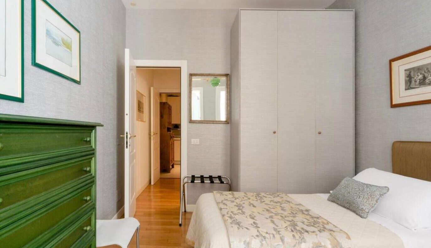 L’appartamento è composto da una camera con letto matrimoniale e una camera con due letti singoli, un ampio soggiorno, una cucina e due bagni. Il divano in soggiorno può diventare un comodo e ampio letto, per questo motivo l’appartamento si presta comodamente ad ospitare fino a 6 persone. L’appartamento è situato al primo piano del palazzo e dispone di ascensore.